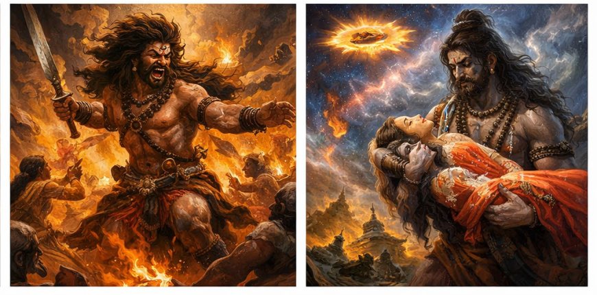 उन्होंने यज्ञ की वेदी को नष्ट कर दिया। फिर, उन्होंने वेद पढ़ रहे ब्राह्मणों को भगा दिया। उनकी आँखों में बस एक ही लक्ष्य था: दक्ष, वीरभद्र के सामने कोई नहीं टिक सकता था। वह अकेले थे, लेकिन शिव का ही एक अंश थे। उनका हर वार शिव का श्राप था, और हर दहाड़ सती का विलाप थी। आखिर में, वह दक्ष के सामने खड़े हो गए। दक्ष, जो अभी भी अपने घमंड में डूबे हुए थे, चिल्लाए, "मैं यज्ञ कर रहा हूँ। मुझे कोई नहीं रोक सकता।" वीरभद्र ने उनकी आँखों में देखा और कहा, "तुम पिता कहलाने के लायक नहीं हो।" "आज मैं तुम्हें उसी आग में जला दूँगा जिसमें तुमने धर्म का मज़ाक उड़ाया था।" एक ही वार में, वीरभद्र ने अपनी तलवार से दक्ष का सिर काट दिया। पूरी सभा में सन्नाटा छा गया। देवता हैरान रह गए। यज्ञ की आग बुझ गई, और धरती पर सिर्फ़ राख रह गई। इस घटना के बाद दक्ष का अहंकार पूरी तरह टूट गया और यज्ञ खत्म हो गया। राख का मतलब था अहंकार, अधर्म। वीरभद्र ने शिव की बात मान ली थी। लेकिन कहानी यहीं खत्म नहीं होती। अब वह पल आता है जब शिव खुद यज्ञ स्थल पर पहुंचते हैं। तब उन्हें सती का जला हुआ शरीर दिखाई देता है। नज़ारा ऐसा था कि मौत भी आंसुओं से भर गई। शिव ने धीरे-धीरे, कांपते हाथों से, सती के शरीर को अपनी बाहों में उठाया। उनकी आंखों में आंसू आ गए, और फिर वे चले गए। शिव, सती के शरीर को गोद में लेकर ब्रह्मांड में घूमते रहे। एक ऐसा दुख जिसने पूरे ब्रह्मांड को डरा दिया, ब्रह्मांड असंतुलित होने लगा। देवता डर गए। अगर शिव इसी तरह विलाप करते रहे, तो ब्रह्मांड का संतुलन टूट जाएगा। तबाही मच जाएगी। तब सभी देवता भगवान विष्णु के पास गए और ब्रह्मांड को बचाने के लिए प्रार्थना की। तब विष्णु ने अपना सुदर्शन चक्र फेंका। उसने सती के शरीर के टुकड़े-टुकड़े कर दिए। शिव एक पल के लिए रुके लेकिन विरोध नहीं किया। सृष्टि के लिए यह ज़रूरी था। सती के शरीर के हिस्से जहाँ-जहाँ गिरे, वहाँ दिव्य ऊर्जा फैल गई। धरती पर ये जगहें शक्ति से भर गईं, और शक्तिपीठ मानी गईं। ये कोई आम जगहें नहीं थीं। ये शिव और सती के बीच हमेशा रहने वाले प्यार के गवाह थे।